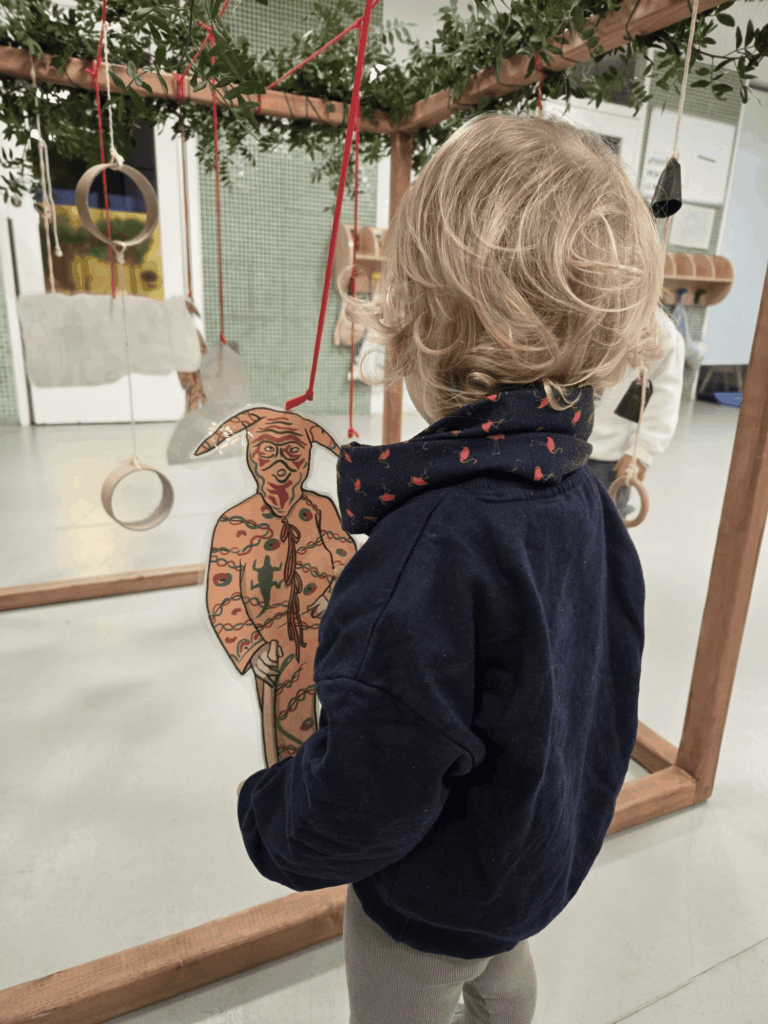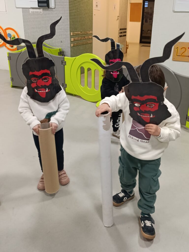 Els jocs simbòlics i d’exploració són un eix central. Mitjançant materials adaptats a la seva edat (imatges de dimonis i foguerons, teles de colors vermells i negres, picarols, elements naturals,…) els infants experimenten, manipulen i descobreixen. Aquest contacte directe amb els materials els permet construir coneixements des del cos i l’acció, respectant els seus ritmes individuals.